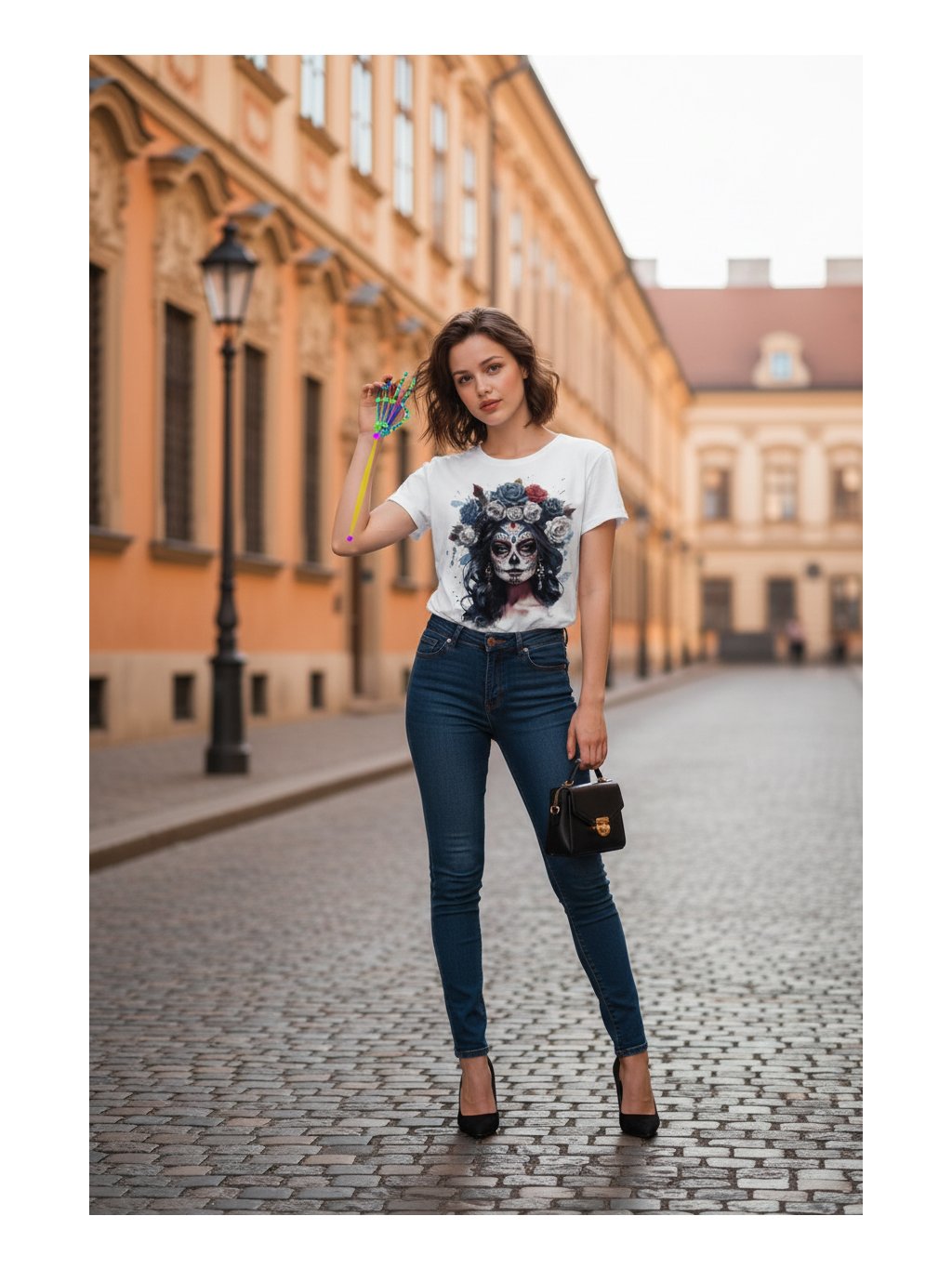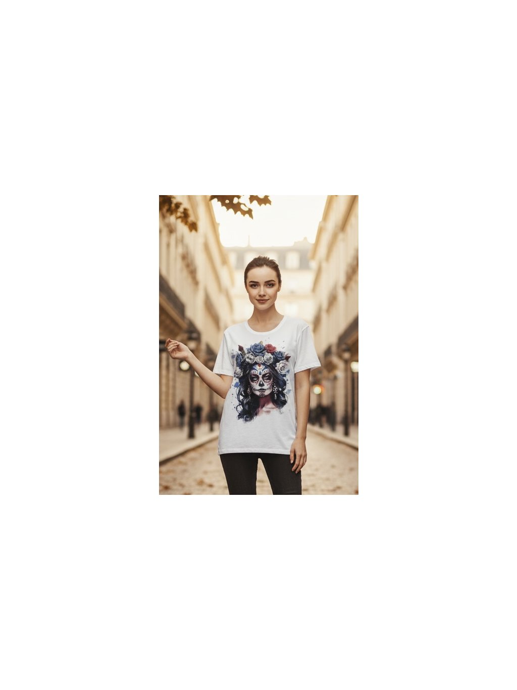 Bílé tričko s barevným potiskem sugar skull lebky. Super příjemný materiál