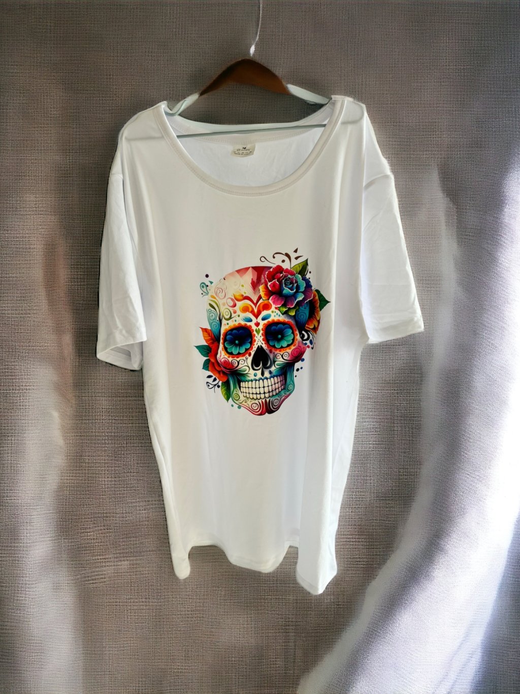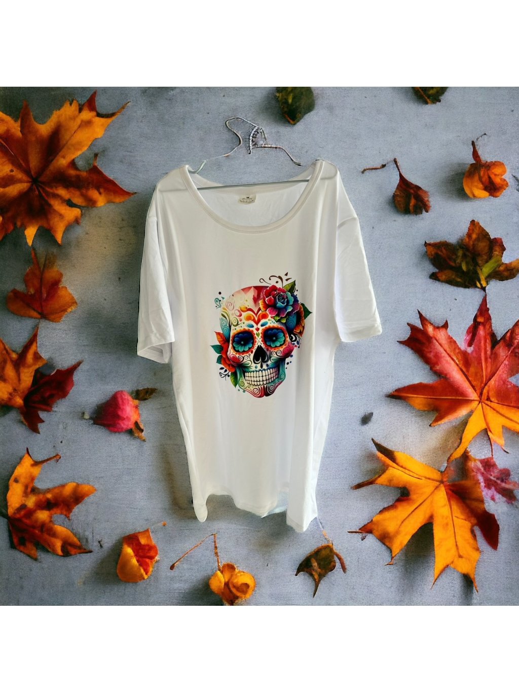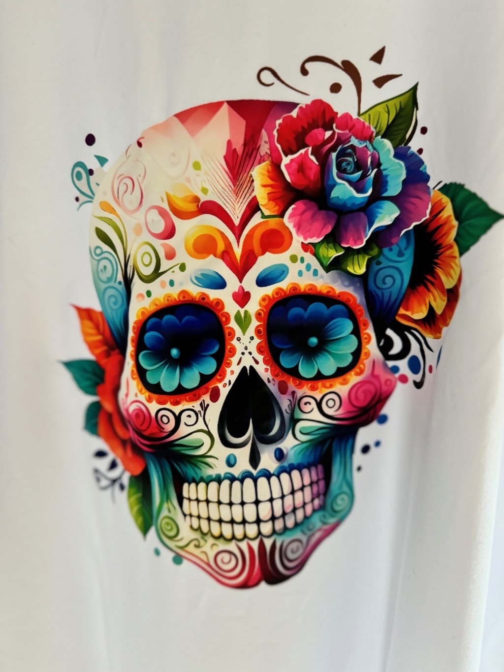 This white tee features a bold sugar skull print in full color, offering contrast, attitude, and maximum comfort thanks to its super soft fabric.
