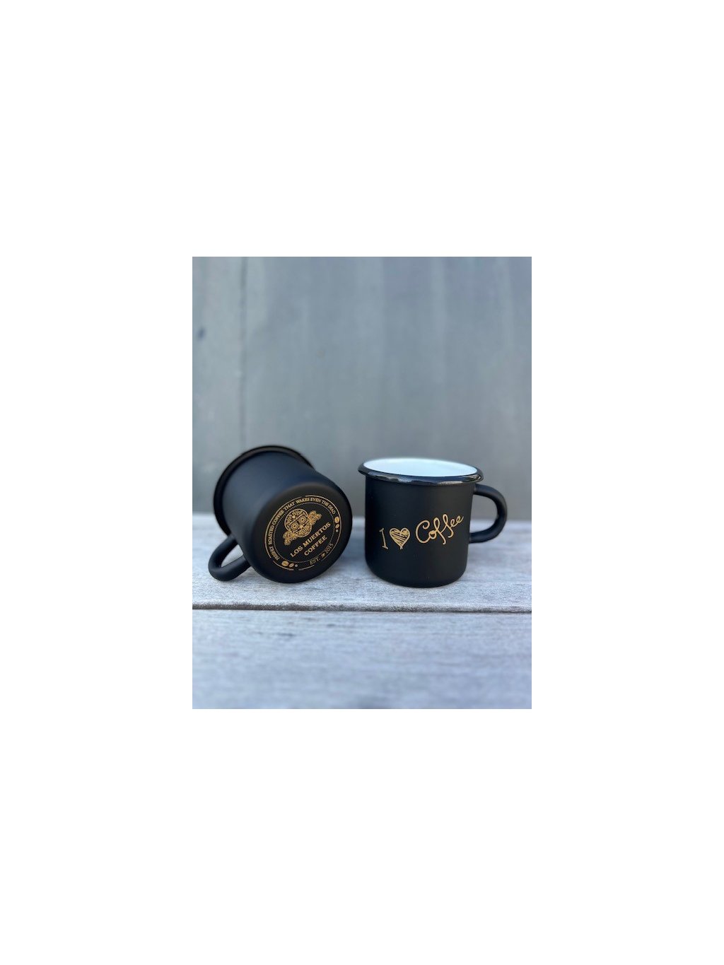 The enamel mug is a great addition to your kitchen and for outdoor coffee trips. The design of the cup is matte white with a glossy print "I love coffee".