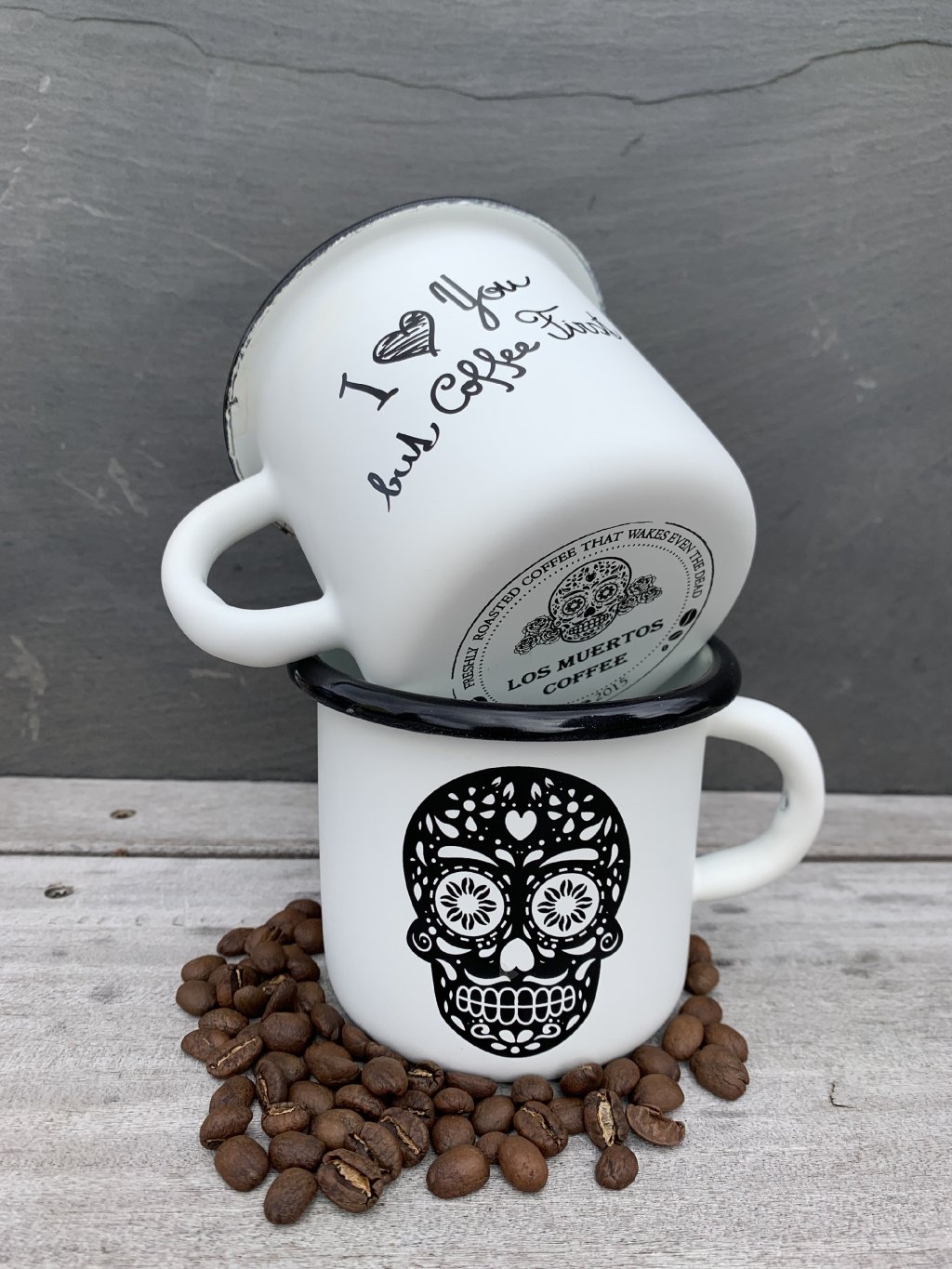 The enamel mug is a great addition to your kitchen and for outdoor coffee trips. The design of the cup is matte white with a glossy print "I Love You but Coffee First" and sugar skull at the opposite site