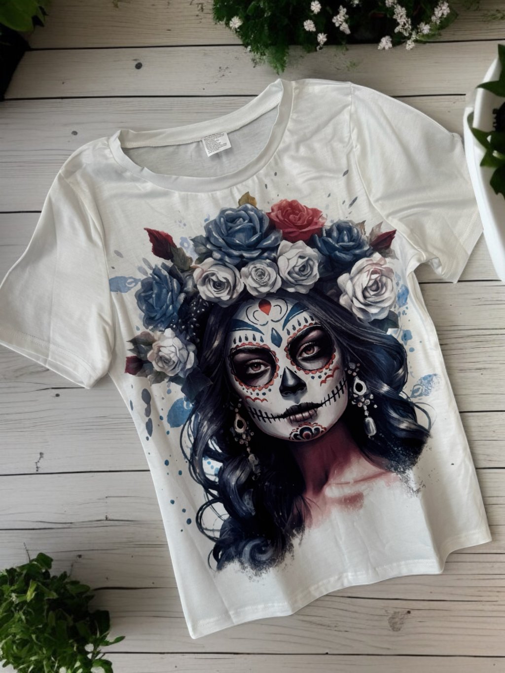 White and bold from both sides, this T-shirt features a colorful sugar skull design that keeps the energy going whether you’re coming or going.